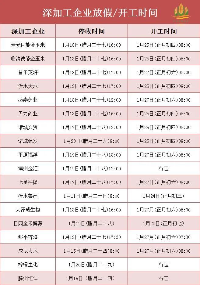 諸城興貿(mào)公司玉米收購工作于2023年1月19日(臘月二十八)12:00點停止收購;2023年1月25日(正月初四)8:00開始正常收購。