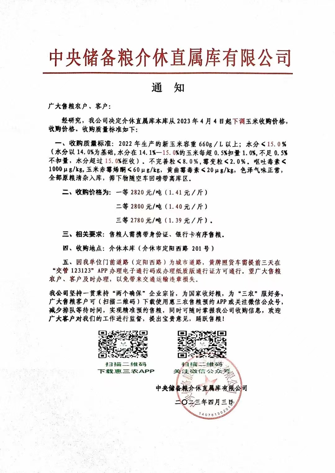 2023年4月4日中儲糧介休直屬庫玉米價格調(diào)整通知