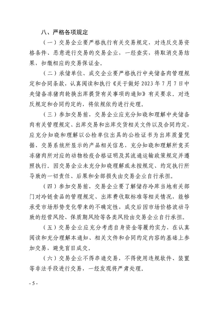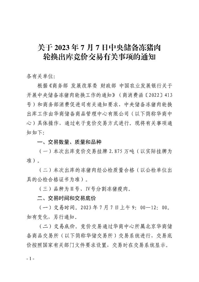 關于2023年7月7日中央儲備凍豬肉輪換出庫競價交易有關事項的通知
