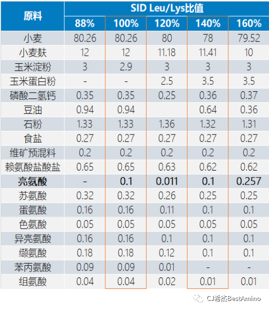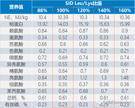 3.日糧亮氨酸過高(SID Leu/Lys比值140%)時(shí),需要注意平衡異亮氨酸、纈氨酸、色氨酸和賴氨酸水平。