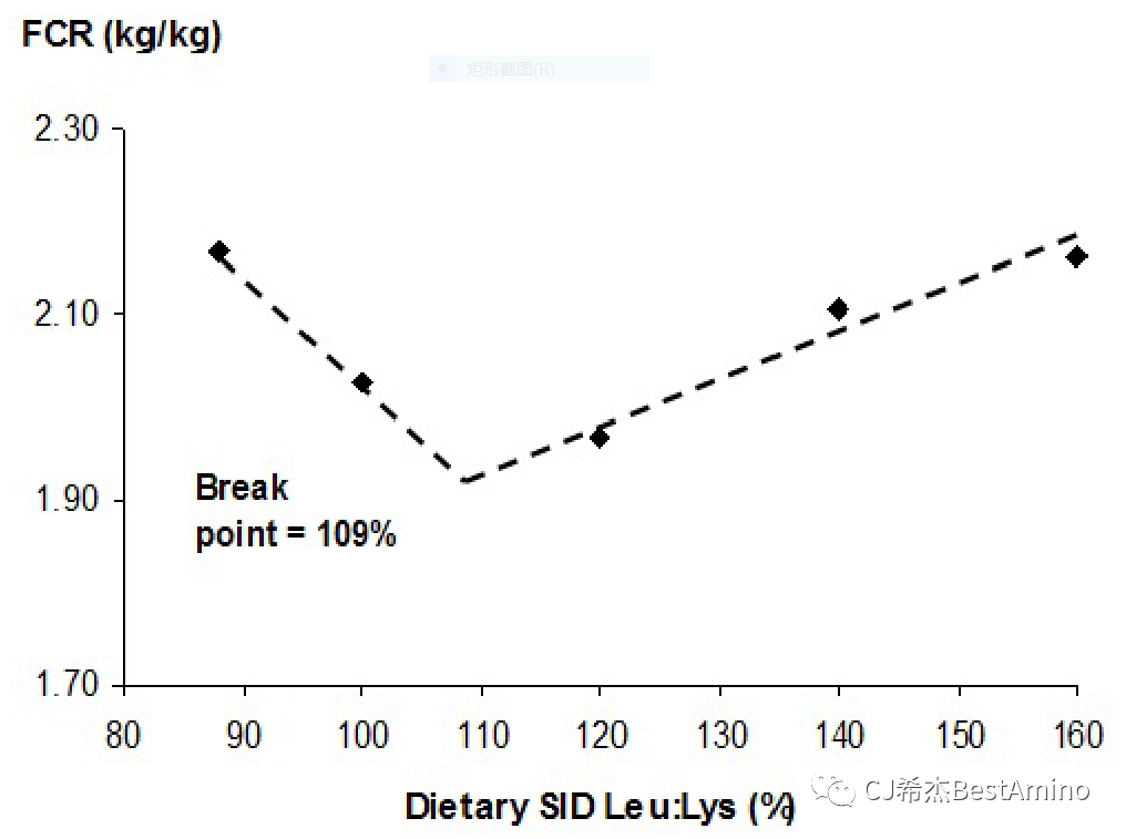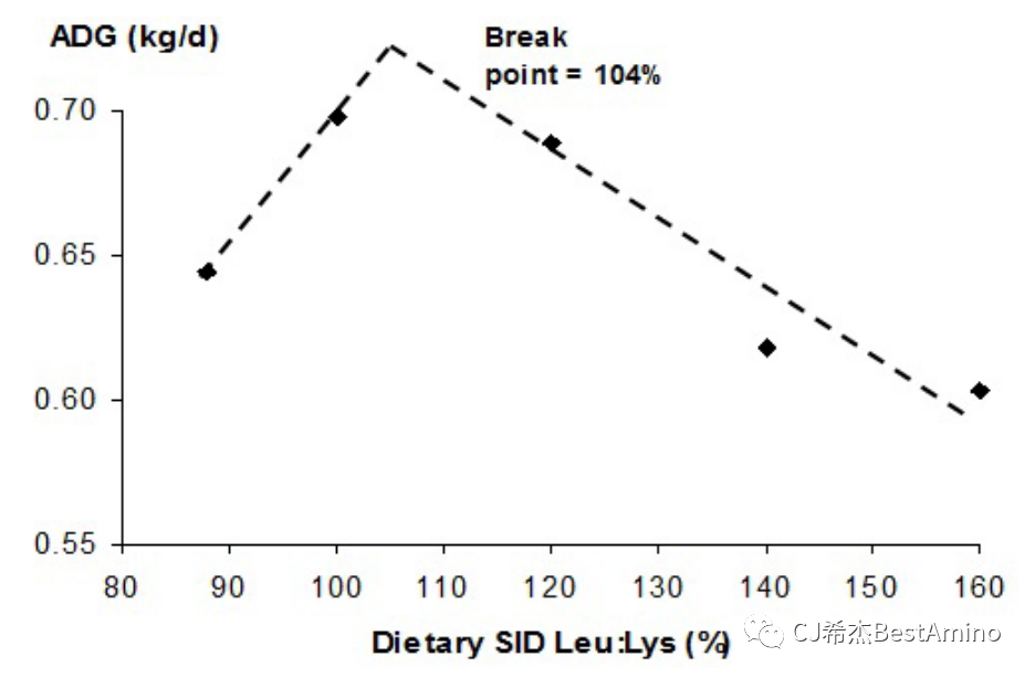 1.日糧亮氨酸與賴氨酸比值生長豬生長性能(ADG和FCR),以ADG和FCR為指標(biāo),最佳日糧SID Leu/Lys比值分別為104%和109%。