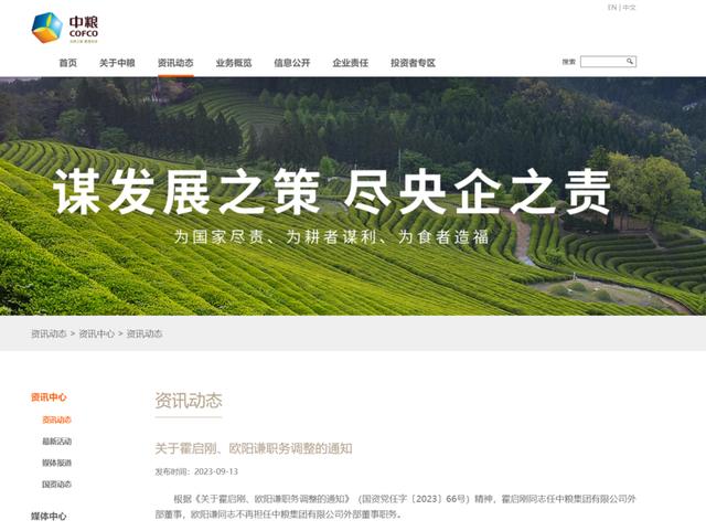 據(jù)中糧集團(tuán)官網(wǎng)9月13日消息,根據(jù)《關(guān)于霍啟剛、歐陽謙職務(wù)調(diào)整的通知》(國(guó)資黨任字〔2023〕66號(hào))精神,霍啟剛同志任中糧集團(tuán)有限公司外部董事,歐陽謙同志不再擔(dān)任中糧集團(tuán)有限公司外部董事職務(wù)。