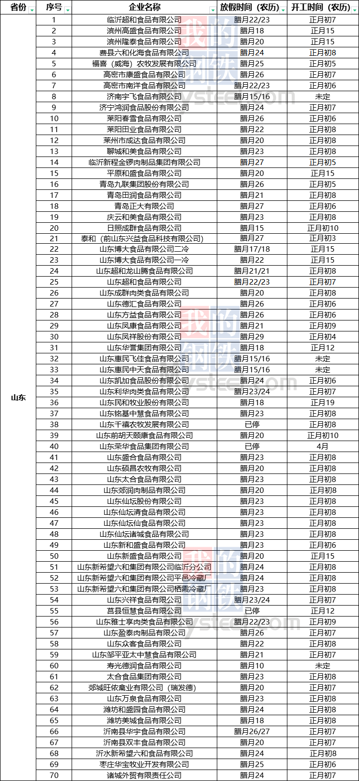 ??特別提醒:由于本次放假開工時間統(tǒng)計時間跨度較長,且年前行情波動較大,部分企業(yè)放假時間節(jié)點或有1-2天左右的變動,若繼續(xù)維持當(dāng)下屠宰虧損和庫存上漲局面,不排除不少企業(yè)有趕計劃前移放假時間點的操作,圖表內(nèi)容僅供參考。