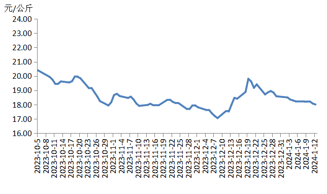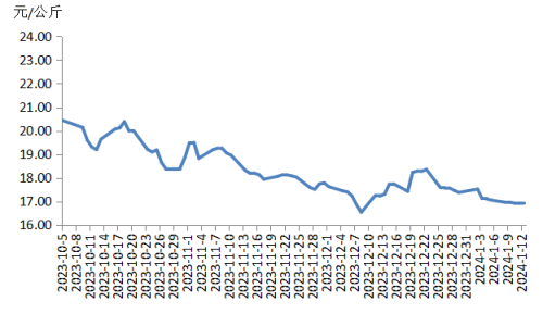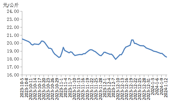 本周國內瘦肉型白條豬肉出廠價格(以下簡稱“豬肉價格”)環(huán)比下跌。周內散養(yǎng)戶和規(guī)模養(yǎng)殖場出欄生豬的積極性較高,宰后均重處于偏高水平,白條豬肉供應充裕。目前腌臘、灌香腸活動熱度下降,春節(jié)前備貨期尚未來臨,豬肉需求量偏低,白條豬肉價格下跌。