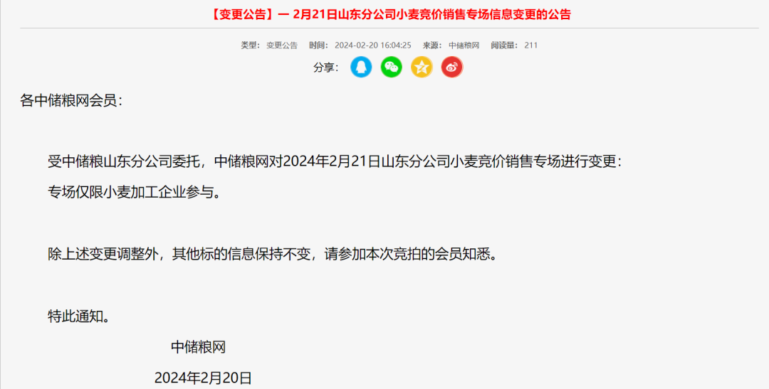 2月20日,中儲(chǔ)糧網(wǎng)發(fā)布最新消息,中儲(chǔ)糧河南分公司2月21日小麥銷售專場、山東分公司2月21日小麥銷售專場、2月22日西安分公司購銷雙向?qū)觥?月22日北京分公司購銷雙向?qū)觥?月22日湖北分公司購銷雙向?qū)龆缄懤m(xù)進(jìn)行變更:僅限小麥加工企業(yè)參與。