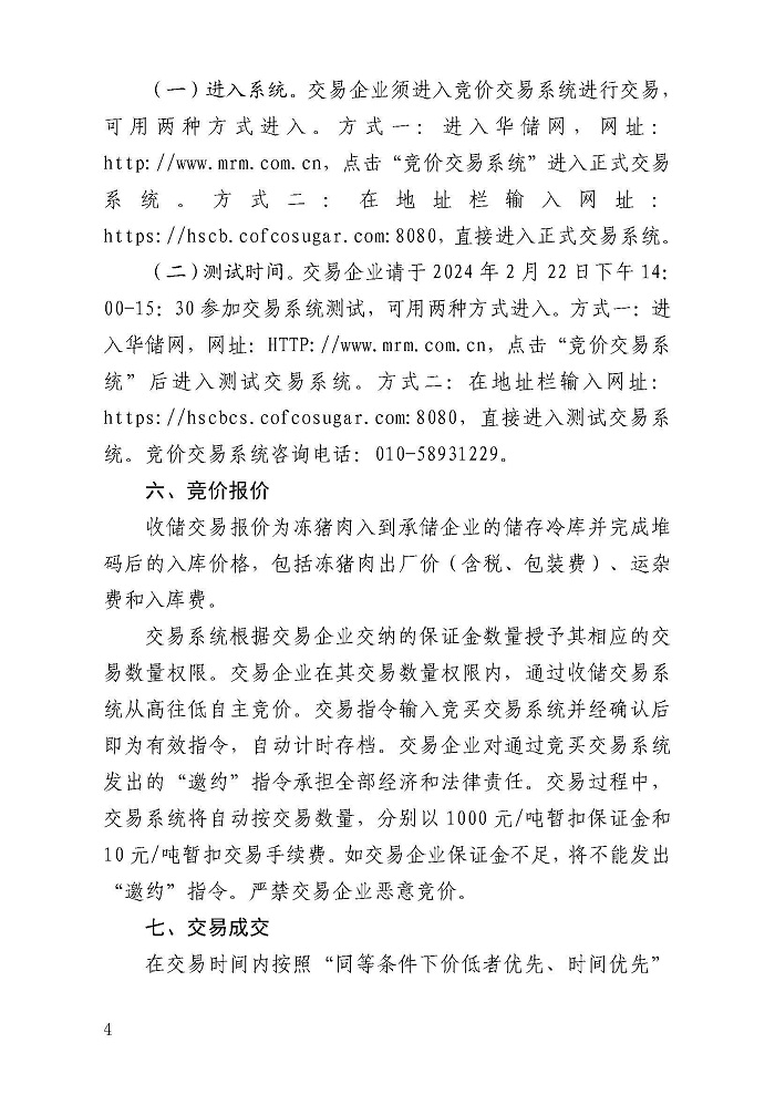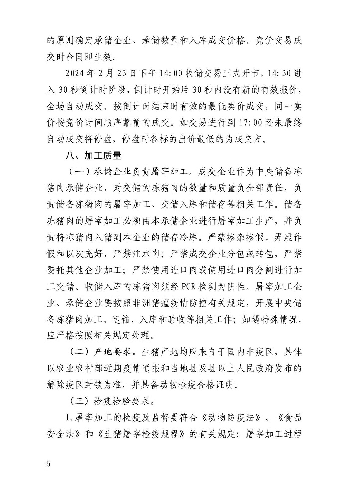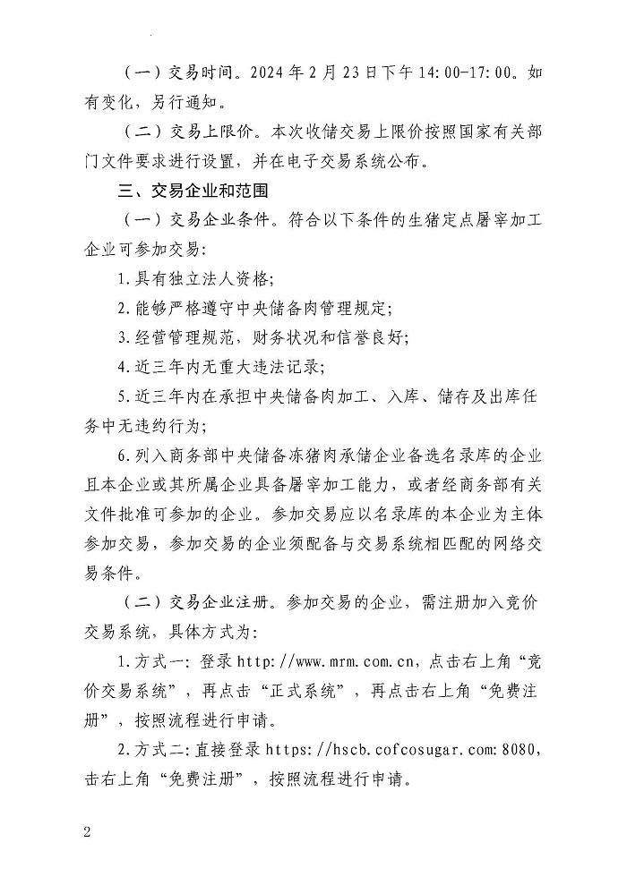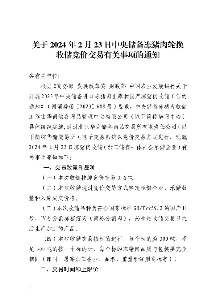 華儲網(wǎng)2月19日發(fā)布關(guān)于2024年2月23中央儲備凍豬肉輪換收儲競價交易有關(guān)事項的通知。本次收儲掛牌競價交易3萬噸,交易時間為2024年2月23日下午14:00-17:00。