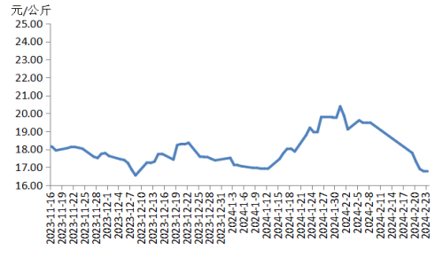 據(jù)農(nóng)業(yè)農(nóng)村部信息中心和山東卓創(chuàng)資訊股份有限公司聯(lián)合監(jiān)測,2024年第8周(即2024年2月19日-2月23日,以下簡稱本周),16省(直轄市)瘦肉型白條豬肉出廠價格總指數(shù)的周平均值為每公斤18.86元,較節(jié)前(第6周,下同)下跌15.9%,同比下跌5.1%。