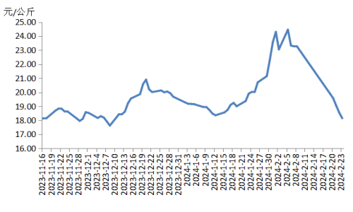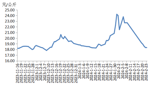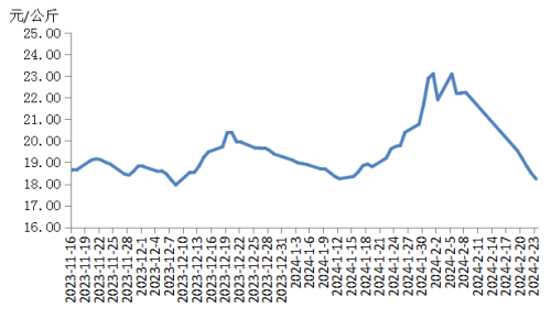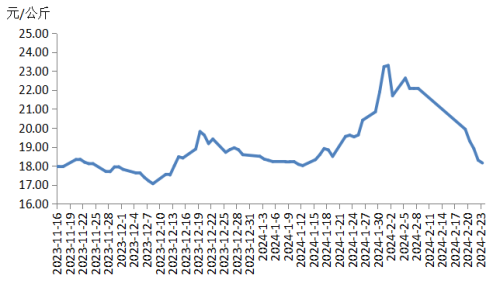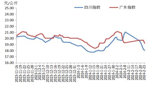 本周,四川豬肉周均價為每公斤18.78元,較節(jié)前下跌7.5%,同比下跌1.9%,同比由上周上漲12.2%轉(zhuǎn)為下跌1.9%。川內(nèi)散養(yǎng)戶出欄生豬的積極性較高,受天氣、價差等因素影響,外調(diào)生豬及豬肉訂單量減少,于是川內(nèi)豬肉供應(yīng)增多。當(dāng)前川內(nèi)居民仍以消化家庭存貨為主,批發(fā)市場交易清淡,經(jīng)銷商采購較為謹(jǐn)慎??傮w看供大于求,豬肉均價明顯下跌。