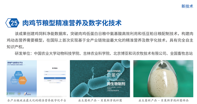 其中,由中國農(nóng)業(yè)大學(xué)動物科技學(xué)院、吉林農(nóng)業(yè)科學(xué)院、北京博亞和訊農(nóng)牧技術(shù)有限公司、全國畜牧總站研發(fā)的“肉雞節(jié)糧型精準營養(yǎng)及數(shù)字化技術(shù)”入選2025中國農(nóng)業(yè)重大新技術(shù)。