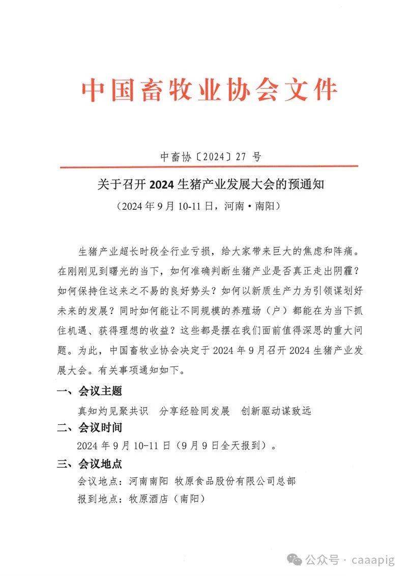 生豬行業(yè)超長時段虧損,給大家?guī)砭薮蟮慕箲]和陣痛。在剛剛見到曙光的當下,如何準確判斷生豬產業(yè)是否真正走出陰霾?如何保持住這來之不易的良好勢頭?如何以新質生產力引領謀劃好未來的發(fā)展?同時如何能讓不同規(guī)模的養(yǎng)殖場(戶)都能在為當下抓住機遇、獲得理想的收益?這些都是擺在我們面前值得深思的重大問題。為此,中國畜牧業(yè)協(xié)會決定于2024年9月召開2024生豬產業(yè)發(fā)展大會。有關事項通知如下。
