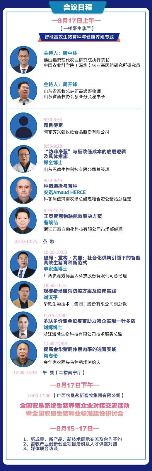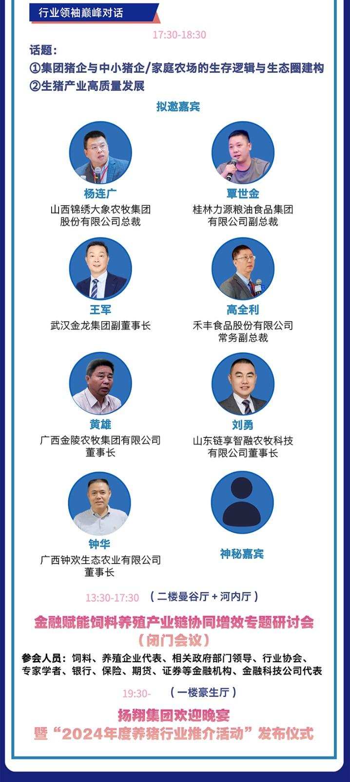 行業(yè)主管部門領(lǐng)導(dǎo),院士、知名專家;全國top30集團豬企高管、區(qū)域性養(yǎng)豬龍頭企業(yè)、規(guī)模豬場負責(zé)人、生產(chǎn)技術(shù)總監(jiān)、業(yè)務(wù)骨干等;養(yǎng)殖、育種、飼料、獸藥、疫苗、設(shè)備、數(shù)智化生產(chǎn)管理等生豬產(chǎn)業(yè)鏈上下游企業(yè)代表;地方行業(yè)學(xué)協(xié)會、生豬產(chǎn)業(yè)技術(shù)體系專家;國內(nèi)大專院校、科研院所專家學(xué)者;生豬期貨及銀行、保險等金融機構(gòu)代表;媒體記者。