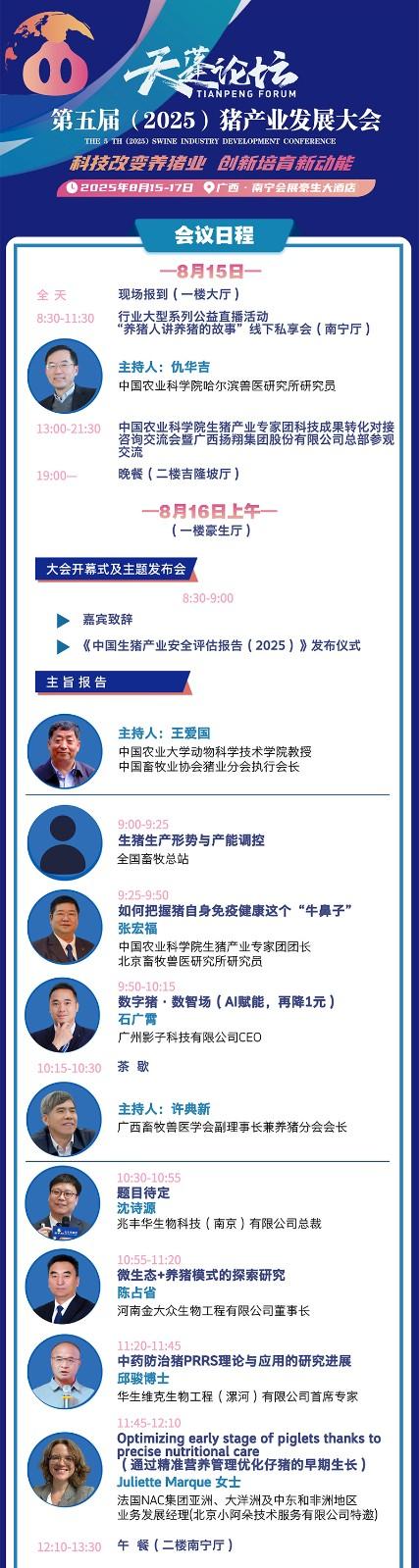 論壇已成功舉辦四屆,我們將充分利用天蓬論壇—豬產(chǎn)業(yè)發(fā)展大會這一平臺的賦能賦智作用,研判行業(yè)態(tài)勢,展示前沿成果,增進產(chǎn)業(yè)對接,促進成果轉(zhuǎn)化,推動生豬種業(yè)創(chuàng)新、健康養(yǎng)殖、數(shù)字轉(zhuǎn)型和綠色發(fā)展,加快培育和形成生豬產(chǎn)業(yè)新質(zhì)生產(chǎn)力,為生豬產(chǎn)業(yè)高質(zhì)量發(fā)展貢獻更多力量。茲定于2025年8月15-17日在廣西南寧會展豪生大酒店舉辦“天蓬論壇--第五屆(2025)豬產(chǎn)業(yè)發(fā)展大會”。我們熱忱歡迎各位行業(yè)同仁蒞臨本次大會!現(xiàn)將大會通知如下: