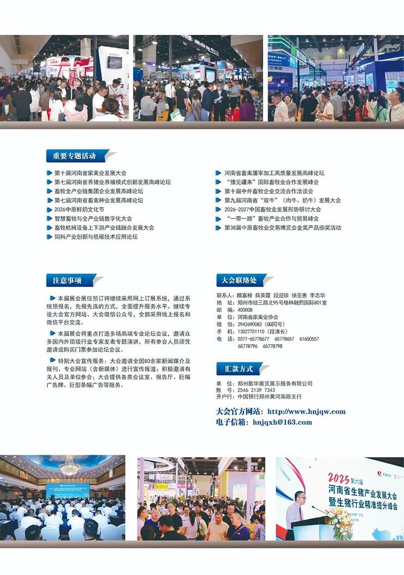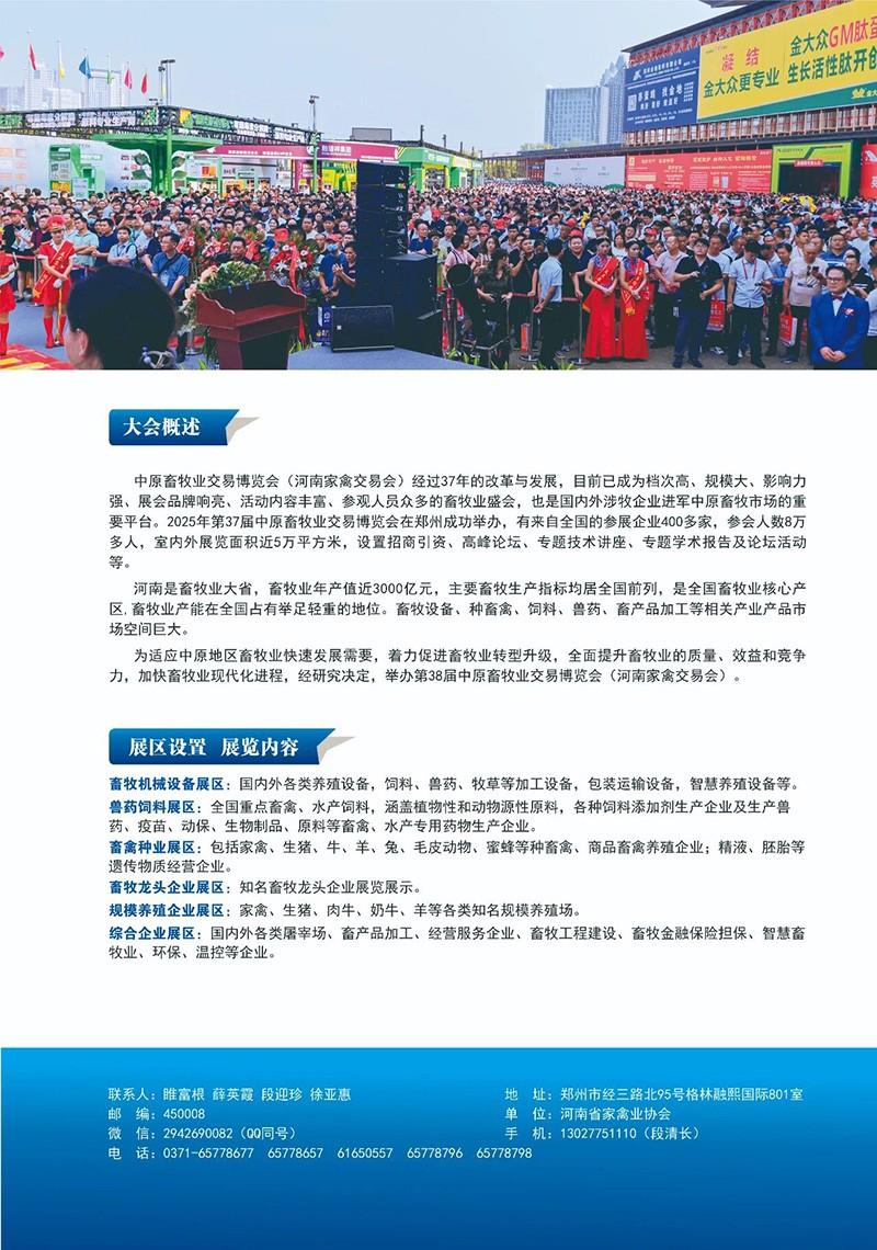 中原畜牧業(yè)交易博覽會(河南家禽交易會)經(jīng)過37年的改革與發(fā)展,目前已成為檔次高、規(guī)模大、影響力強、展會品牌響亮、活動內(nèi)容豐富、參觀人員眾多的畜牧業(yè)盛會,也是國內(nèi)外涉牧企業(yè)進軍中原畜牧市場的重要平臺。2025年第37屆中原畜牧業(yè)交易博覽會在鄭州成功舉辦,有來自全國的參展企業(yè)400多家,參會人數(shù)8萬多人,室內(nèi)外展覽面積近5萬平方米,設(shè)置招商引資、高峰論壇、專題技術(shù)講座、專題學(xué)術(shù)報告及論壇活動等。
